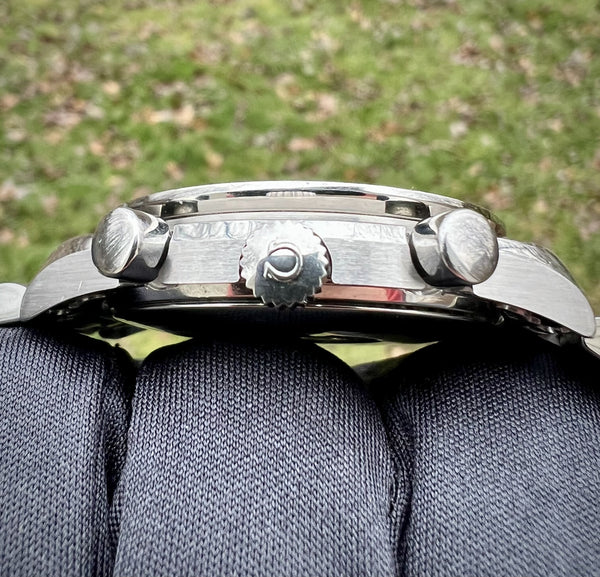 For sale is a stunning example of the Omega Speedmaster Reduced featuring the highly sought-after Marui Panda Dial. This limited and exclusive variation was originally released in the Japanese market, making it a rare and collectible timepiece. The bold panda-style dial offers vintage-inspired charm and timeless aesthetics, reminiscent of iconic chronographs like the Rolex Daytona, but with its own unique Omega flair.