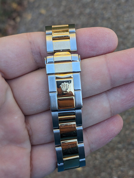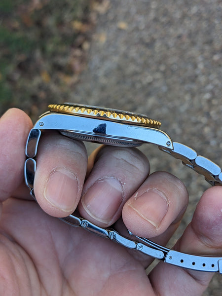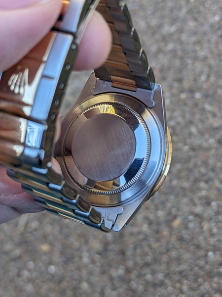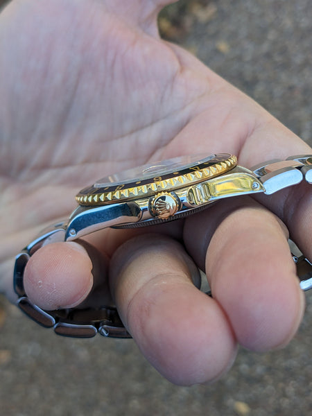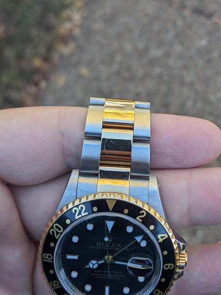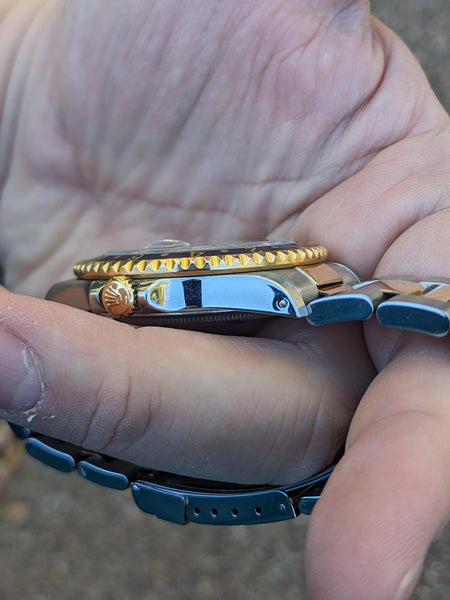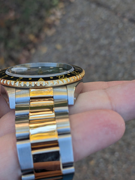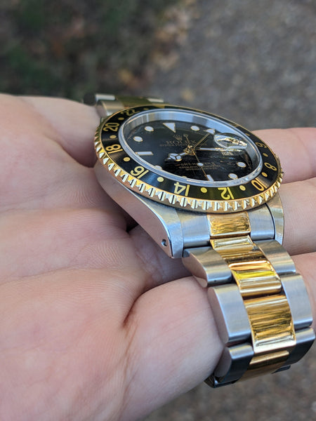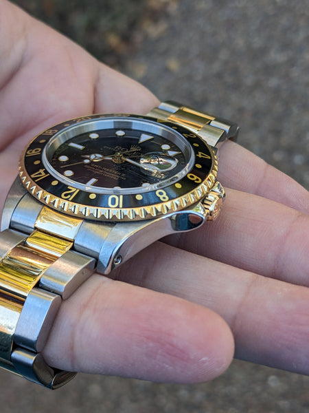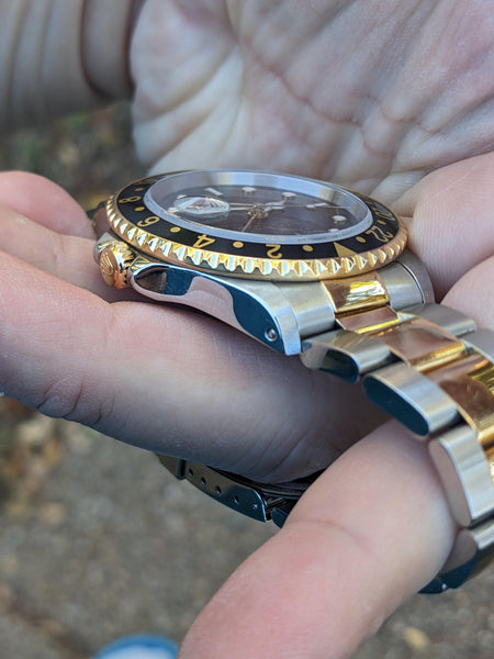A beautiful example of the Rolex GMT Master II 16713, blending 18kt yellow gold with stainless steel in a timeless and functional design. This piece stands out with the coveted gold insert on the clasp—a feature not commonly found on all 16713 models.